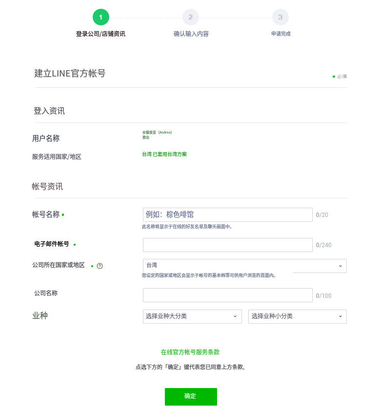 • 业种(行业分类):请务必准确选择。LINE会根据分类向感兴趣的用户推荐您的账号。大类选准,小类选细。