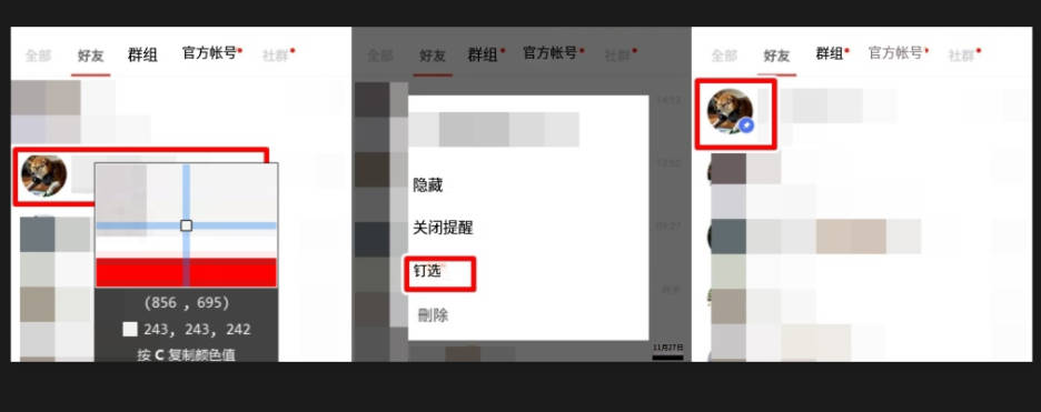 • 结果确认: 此时,该聊天室会立即跳动到列表的最顶端,且右侧会出现一个倾斜的蓝色小图钉标志。